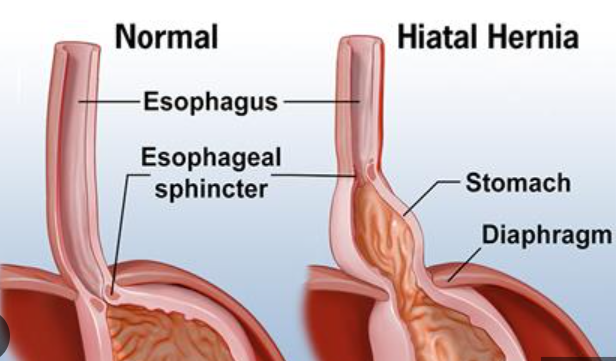 A hiatal hernia is a medical condition in which the upper part of the stomach or other internal organ bulges through an opening in the diaphragm